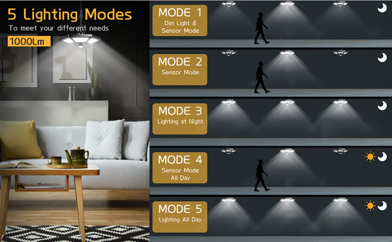 اےutdoor سولر موشن سینسر 5 لائٹنگ موڈز کے ساتھ لائٹس شیڈ کرتا ہے۔