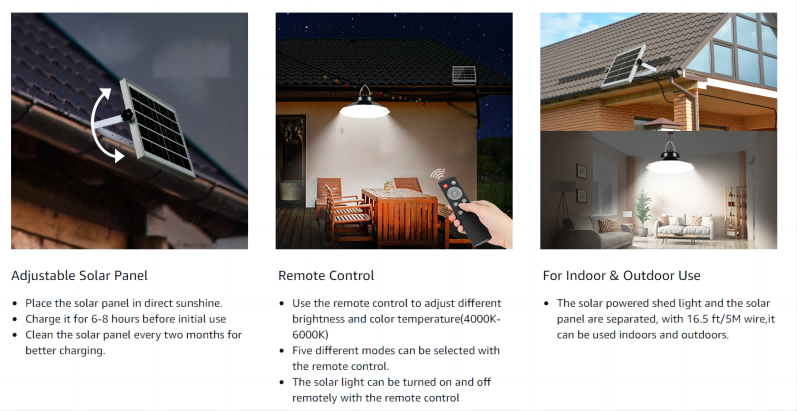 3. IP65 واٹر پروف اور آسان تنصیب سولر بارن لائٹس آؤٹ ڈور واٹر پروف لائٹ IP65 واٹر پروف ڈیزائن کے ساتھ آتی ہے اور سولر پینل سے 16.4 فٹ کیبل کے ساتھ منسلک ہے۔
